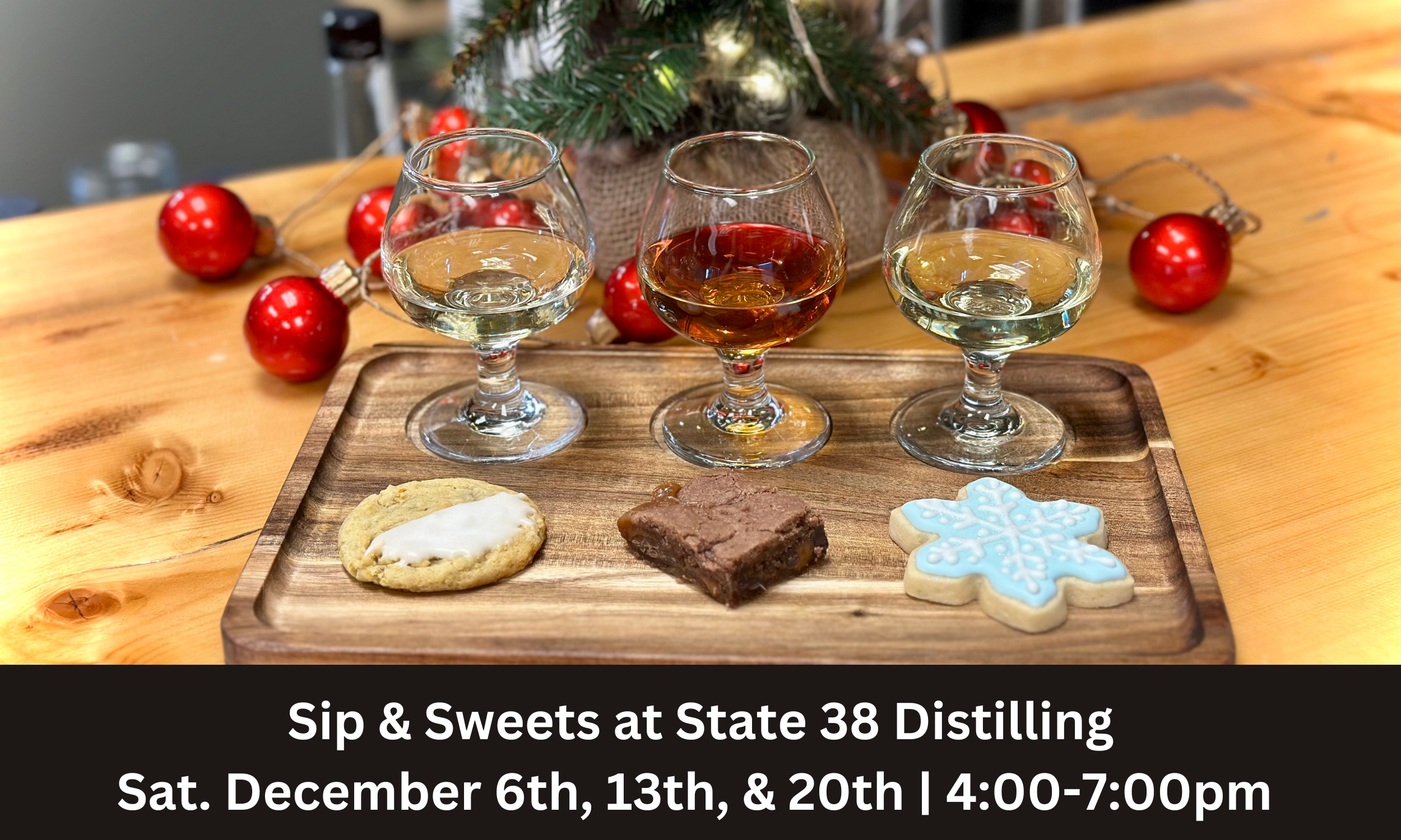 Join us for our festive Sips & Sweets event on December 6, 13, and 20 at our Golden, CO tasting room! Enjoy a curated sweet-and-spirit pairing platter featuring three delicious desserts matched with three of our handcrafted spirits—Bourbon, Reposado, and Absinthe. Each pairing is designed to highlight the flavors of the season and elevate your tasting experience. Platters are $25 and available while supplies last. Treat yourself to a cozy, flavorful holiday evening at State 38!